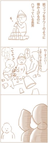 なにかで余った紙コップを積み上げて遊んでいる長男。 それに気付いた次男(1歳)はすぐさま飛んできて崩しにかかります。 しかし長男は諦めず再度積み直し・・・ え・・・なんか余裕あるね君・・・。 長男は本当にやさしい。 長男の優しさ、たまに癒されま…